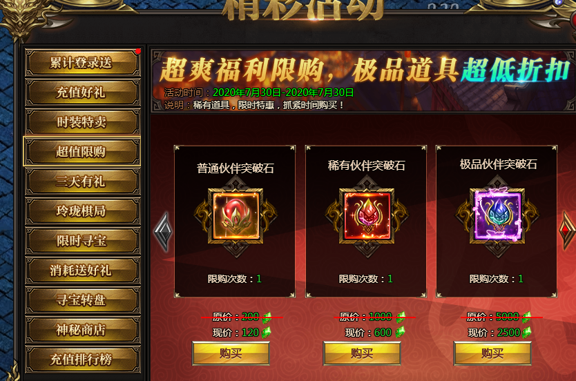 活动说明:各种稀有道具限时购买