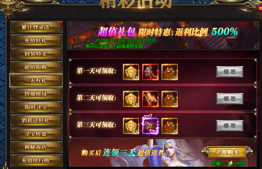 活动说明:一次购买,未来三天每日皆可领取极品奖励,助力成神