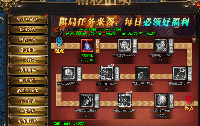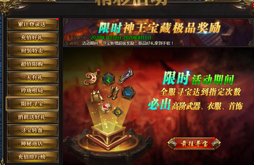 活动说明:神王宝藏限时发放极品装备、神器等,全服寻宝达到一定次数可获得保底奖励