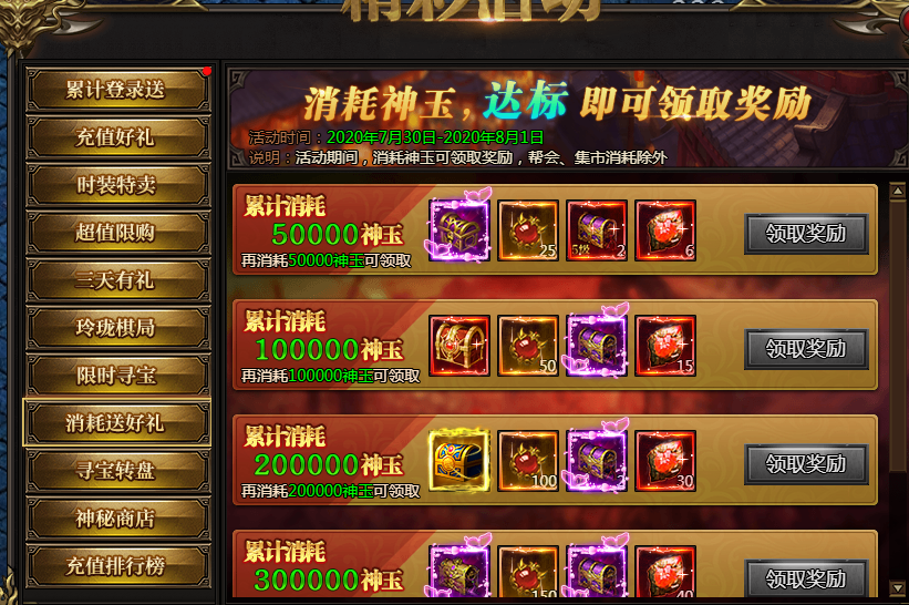 活动说明:活动期间,消耗神玉可以领取奖励,帮会、集市消耗除外