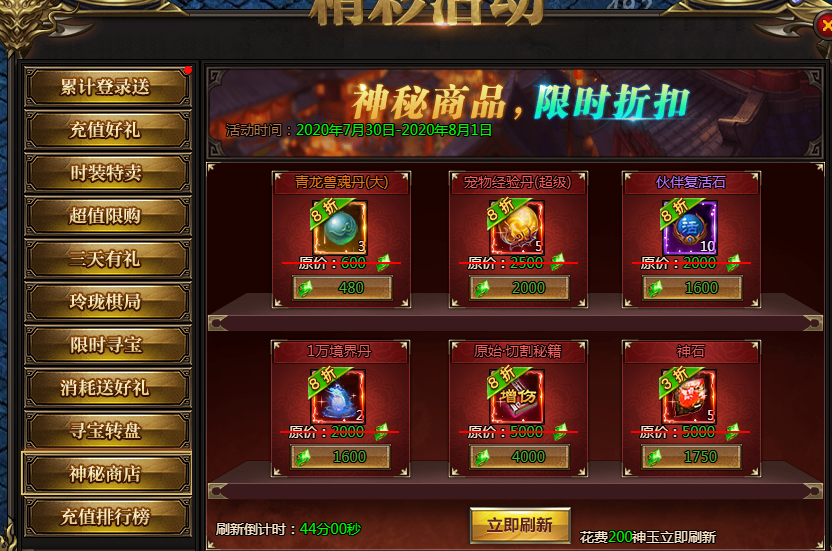 活动说明:神秘商店限时来袭,超低折扣,限时购买。同时可以通过刷新按钮,花费200神玉进行刷新