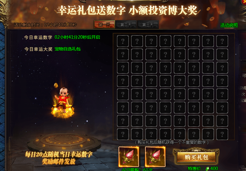 活动说明:购买礼包获得幸运数字,即可参与超级大奖