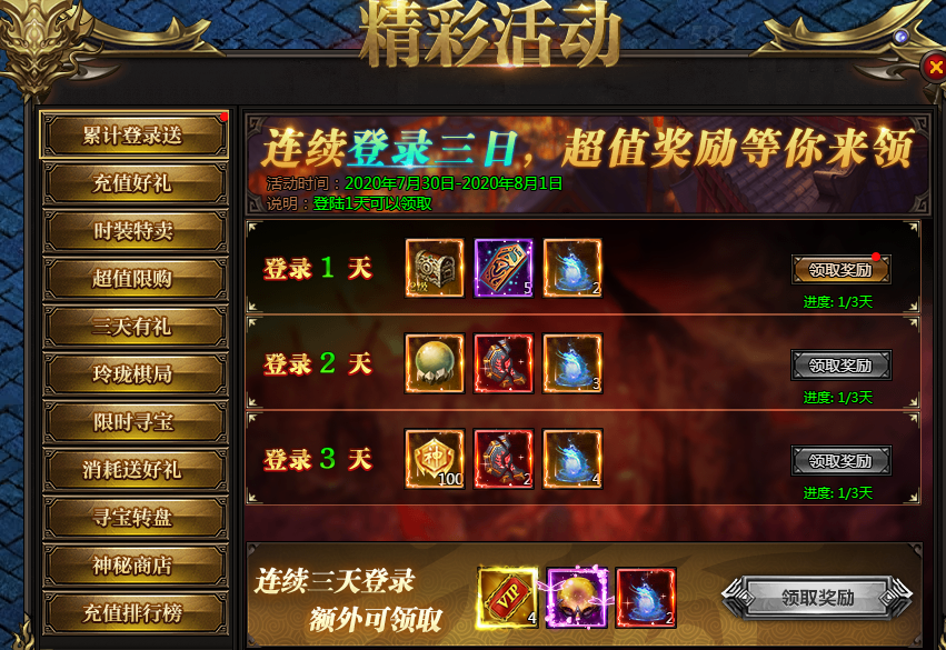 活动说明:活动期间,每天登陆即可领取奖励,连续三天更有额外奖励