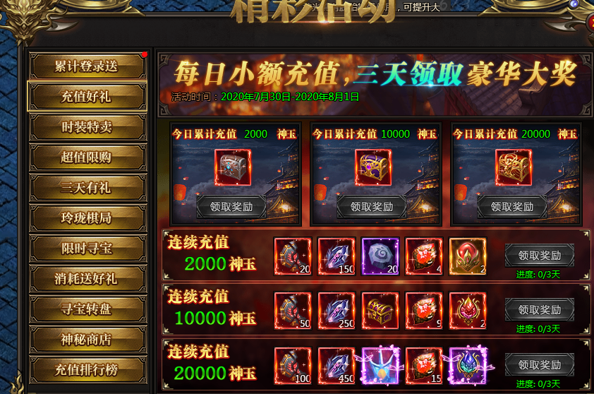 活动说:每日充值可以领取充值宝箱,连续三天充值更有额外极品奖励