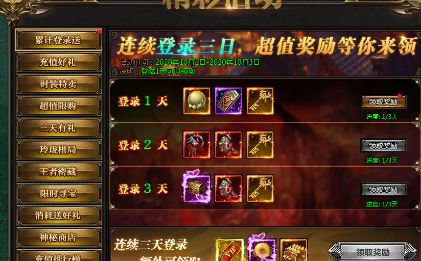 活动说明:活动期间,每天登陆即可领取奖励,连续三天更有额外奖励