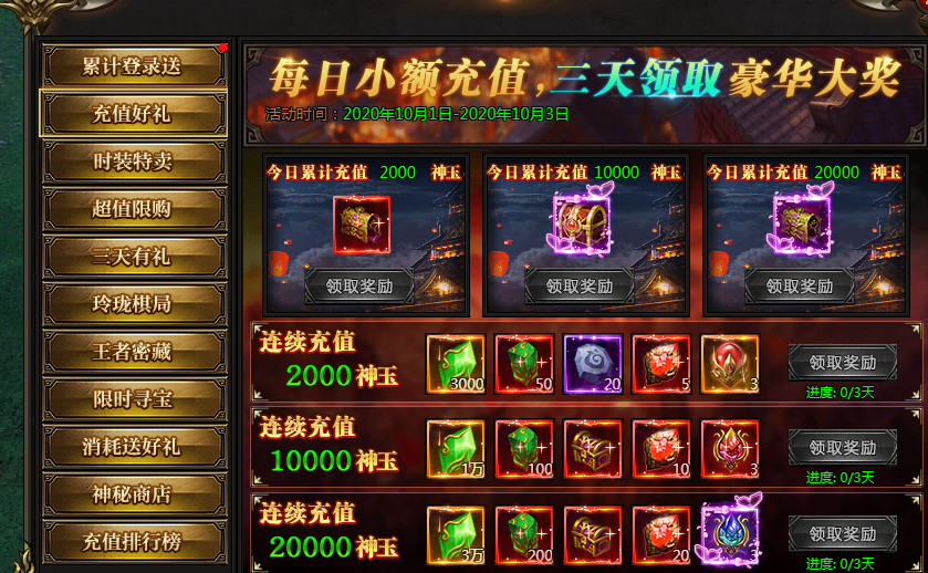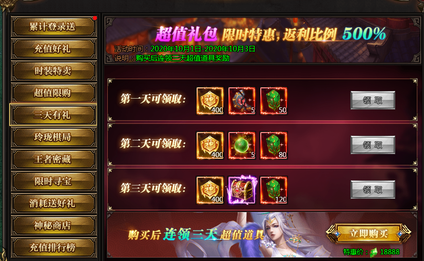 活动说明:一次购买,未来三天每日皆可领取极品奖励,助力成神