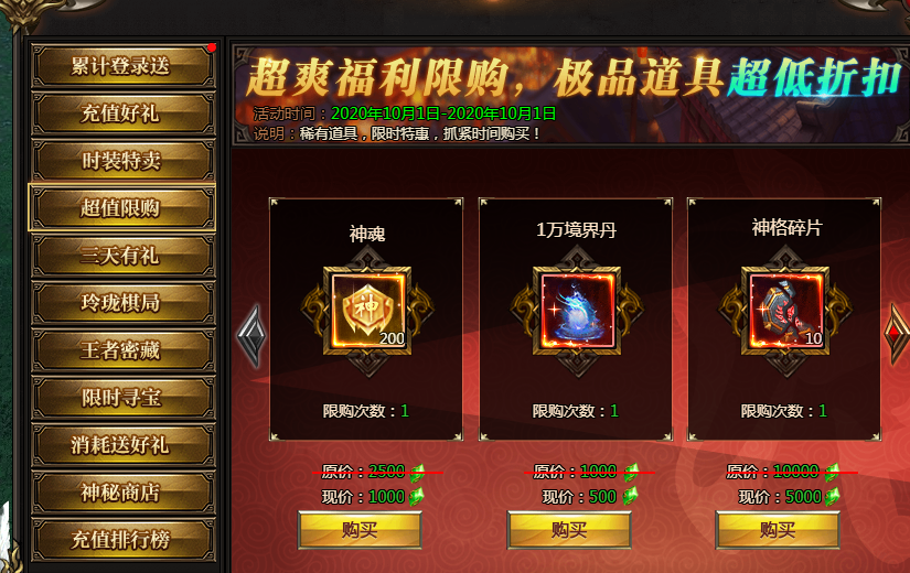 活动说明:各种稀有道具限时购买