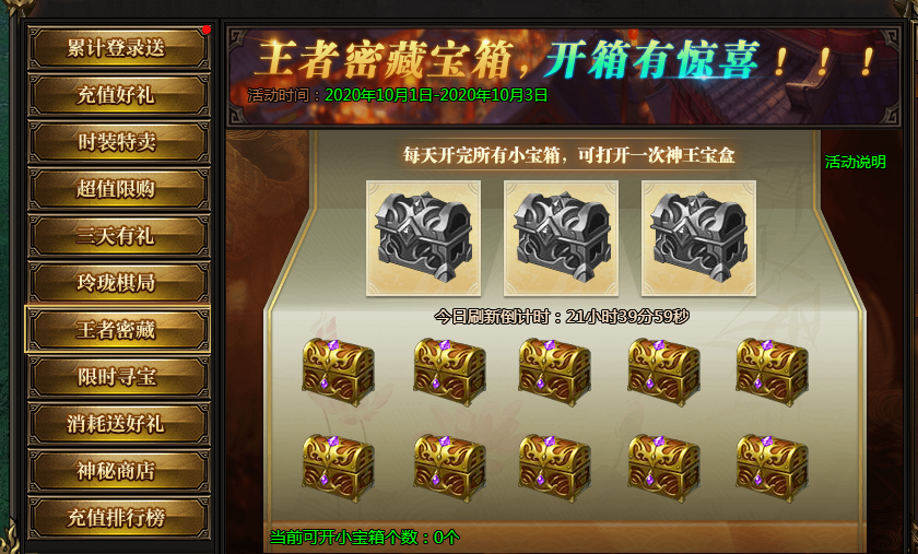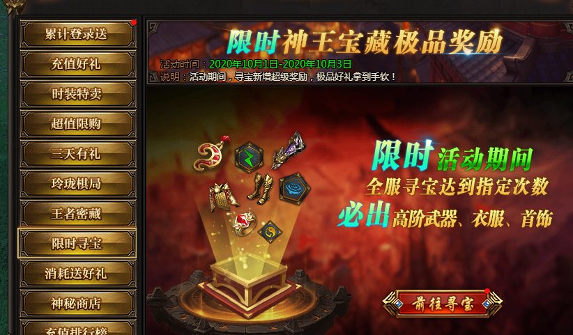 活动说明:神王宝藏限时发放极品装备、神器等,全服寻宝达到一定次数可获得保底奖励