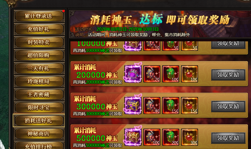 活动说明:活动期间,消耗神玉可以领取奖励,帮会、集市消耗除外