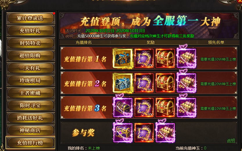 活动说明:名动本服,充值达到100000神玉即可参与排行,前三名均可获得极品自选宝箱。充值达到50000神玉即可获得参与奖。奖励会在活动结束后通过邮件发放