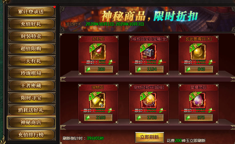 活动说明:神秘商店限时来袭,超低折扣,限时购买。同时可以通过刷新按钮,花费200神玉进行刷新