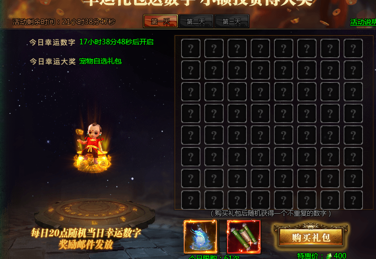 活动说明:购买礼包获得幸运数字,即可参与超级大奖
