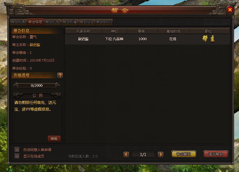 为一些志同道合的玩家创造一个交流的功能,相互帮助,相互扶持,创造一个良好的帮会气氛。创造好的气氛可以通过帮会红包引起帮会的活跃度,每天不同的祈福可以获得相应的奖励以及祈福经验,当祈福经验条满了之后,在帮会boss活动中可以召唤帮会boss,帮会boss的奖励丰富,帮会成员可以一起挑战。