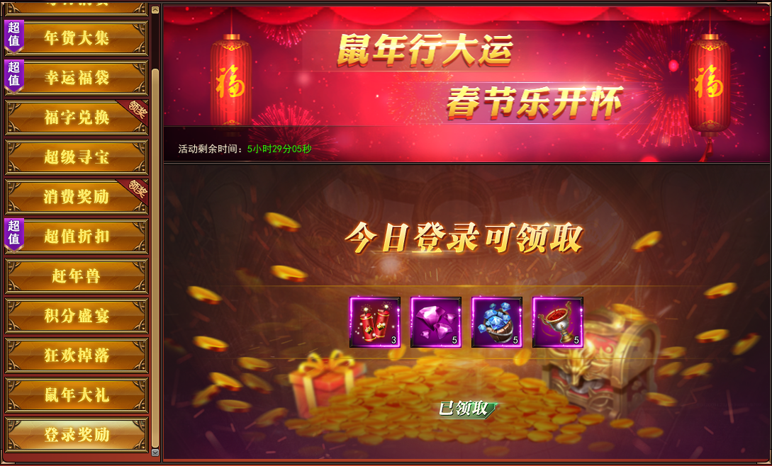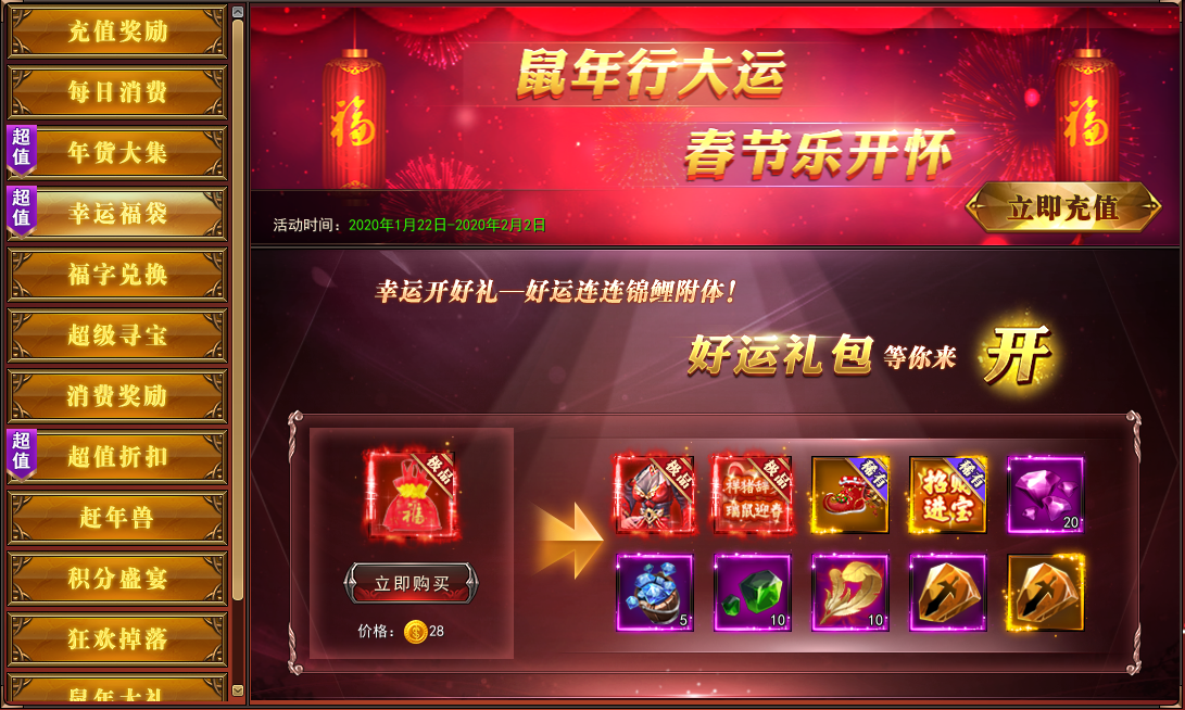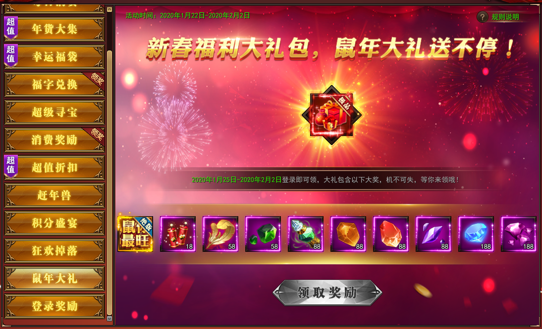 1. 2020年1月25日-2020年2月2日,登录游戏即可领取春节福利礼包