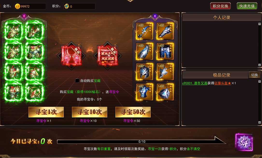 4. 寻宝一次获得1积分,积分永不清空,可在界面右上角的积分兑换里兑换道具。