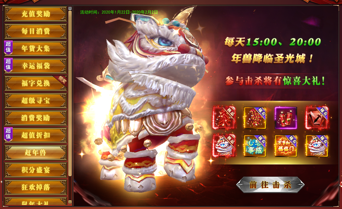 活动期间,每天15:00、20:00在圣光城参与年兽击杀可掉落奖励