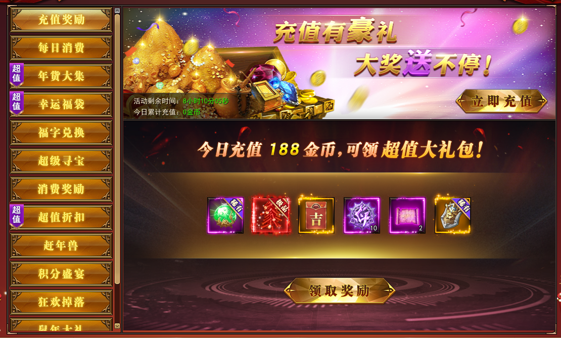 1. 充值达到指定额度可领取超值奖励