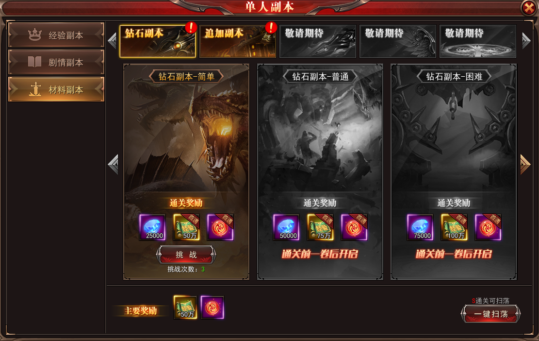 游戏内大量需要的钻石、追加石等珍贵资源均可在材料副本获得。