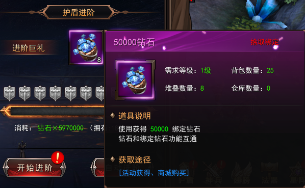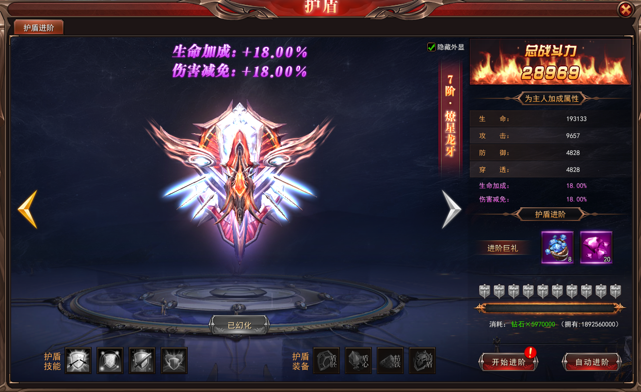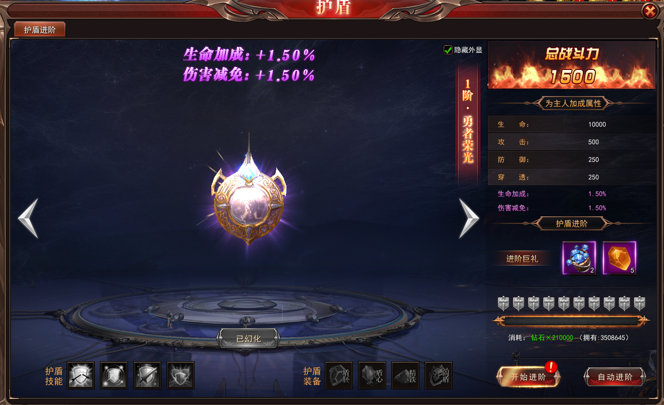 “自动进阶”则在钻石足够的条件下,能够长时间自动进行护盾自动进阶操作,直到关闭护盾进阶界面或进阶到钻石缺少时才会停下。