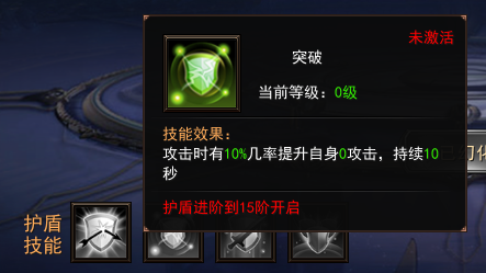 护盾进阶至13阶后会开启第一个护盾技能,随后每隔几阶会开启一个技能,一共四个。护盾技能通过护盾技能书来提升等级。在战斗中有一定几率触发这些技能,且可同时触发多个技能。