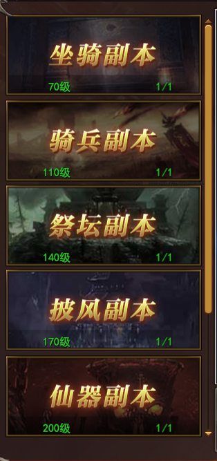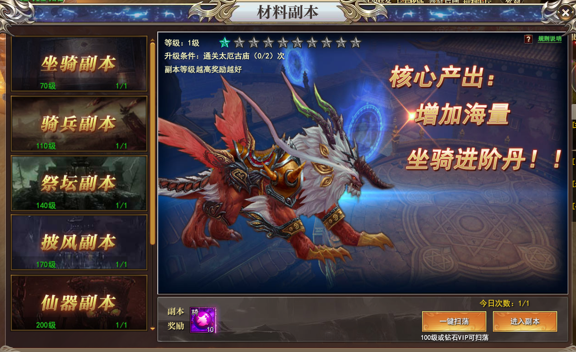 材料副本包括坐骑副本,骑兵副本,祭坛副本,披风副本,仙器副本,魂晶副本,法阵副本等。按照用户角色等级渐次开启。每一个副本都会奖励对应系统的进阶道具。