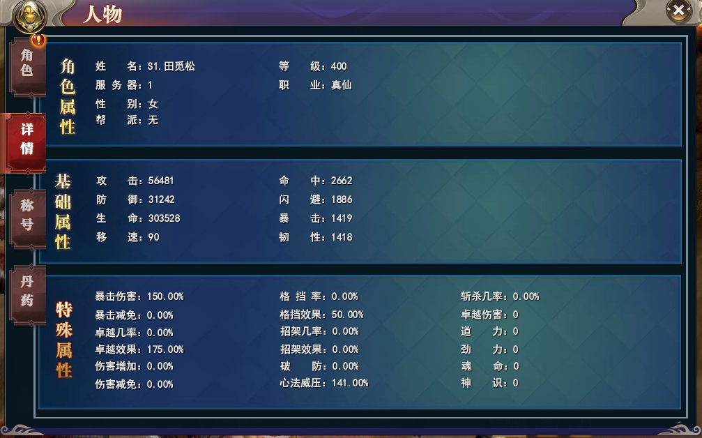 在详情子功能中,用户可以查看到角色的详细属性数值,这些属性数值不仅包括攻击、生命、防御、命中、闪避、暴击、韧性等基础属性,还包括力量、体质、身法、根骨等高级属性。