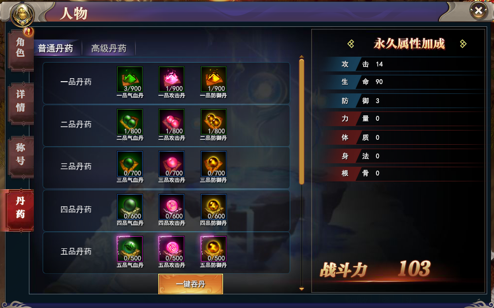 人物系统分为角色、详情、称号和丹药等子功能