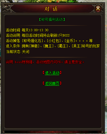 活动内容:活动期间,每天晚上19点准时在王城刷新BOSS【火焰龙帝王】、【圣诞礼物王】、【圣诞雪人王】各1只,身上携带大量金币、屠龙宝箱、高级装备,称号强化石,布料等珍惜物品。