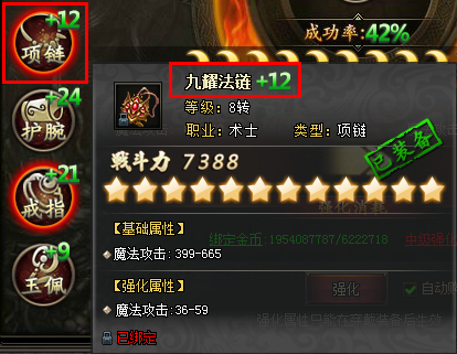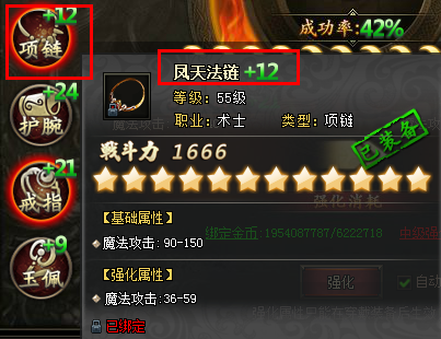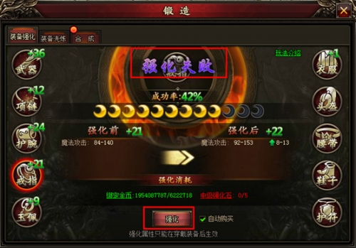 玩家选好要强化的装备位后,点击【强化】按钮即可进行强化。装备强化有一定的成功率,强化失败不掉星。