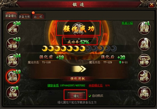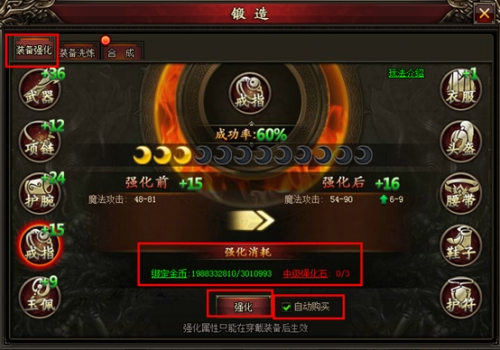玩家勾选“自动购买”后,当强化石不足时,会消耗相应的元宝自动购买