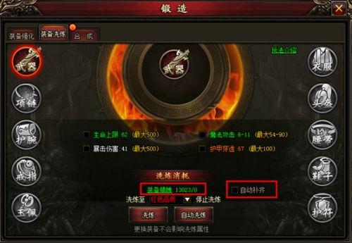 勾选“自动补齐”,缺少装备精魄时,会自动消耗元宝购买。