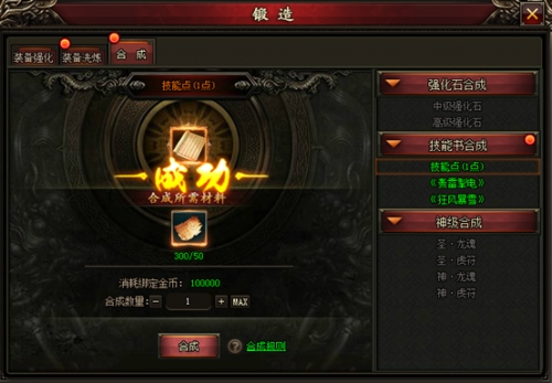 合成分为三类:强化石合成、技能书合成、神级合成。