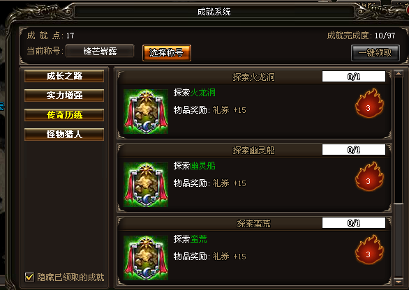 比如探索地图,火龙洞有四层,只要走完四层,就可以增加你的成就点