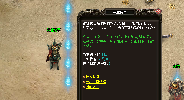 5、当结阵数达到6000时,会刷出一个BOSS。杀死BOSS可以获得经验符、40级装备、极低几率爆出50级装备。