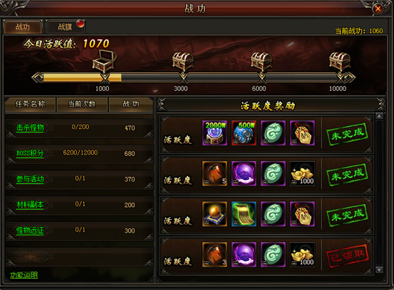 1. 完成功勋任务,获得战功值和活跃值。