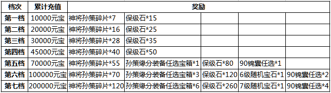 活动内容:玩家在活动期间内,充值达到指定元宝即可在活动结束后获得对应档次奖励一份,充值越多奖励越丰厚。奖励只能领取一档已达成的最高档次奖励,活动时间有限先到先得!