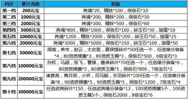 活动内容:玩家在活动期间内,充值达到指定元宝即可在活动结束后获得对应档次奖励一份,充值越多奖励越丰厚。奖励只能领取一档已达成的最高档次奖励,活动时间有限先到先得!
