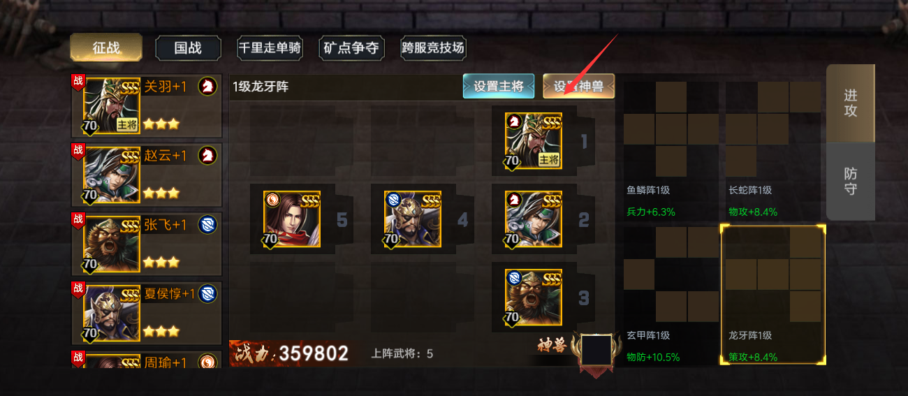 点击右边的阵型进行切换,不同的阵型武将的站位不同,获得不同战斗属性加成