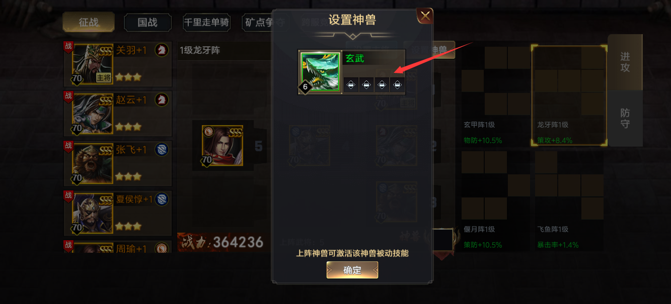 点击“设置神兽”按钮弹出设置神兽页面,神兽上阵后,该神兽技能在战斗中生效