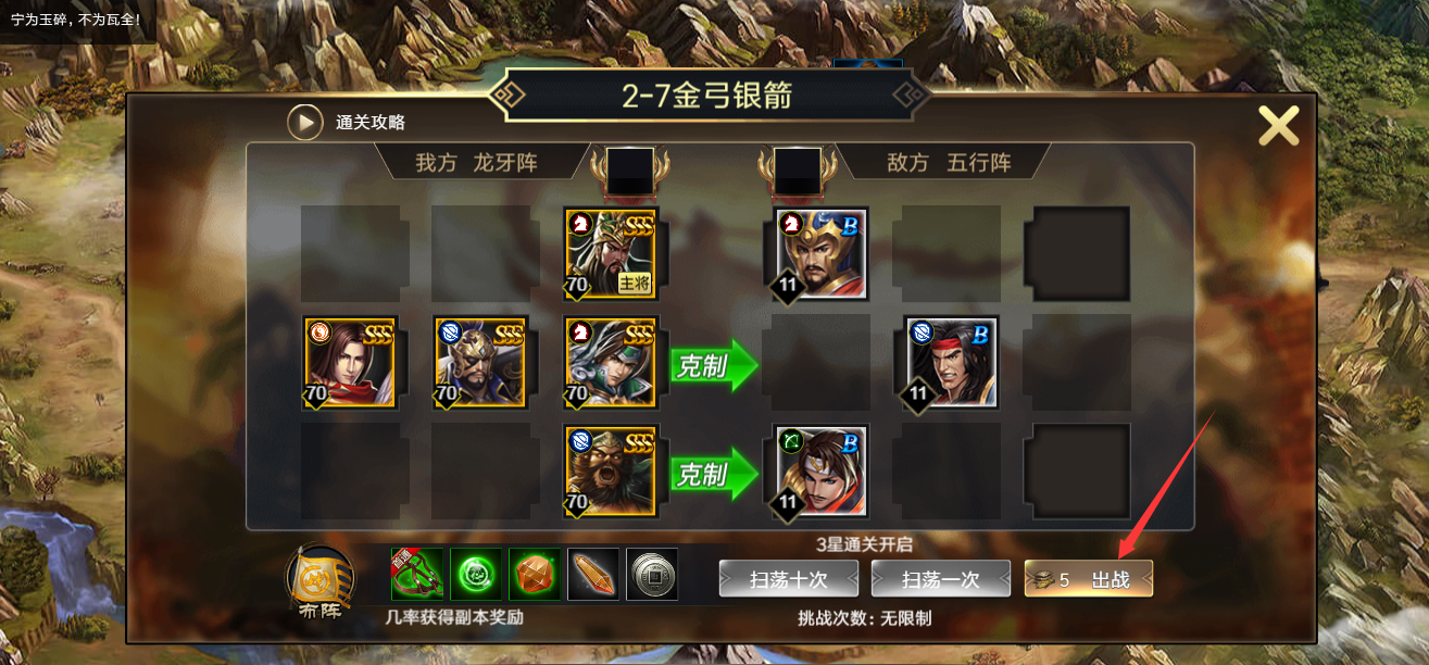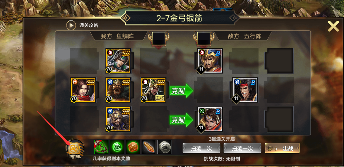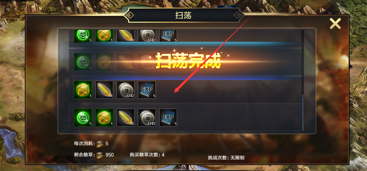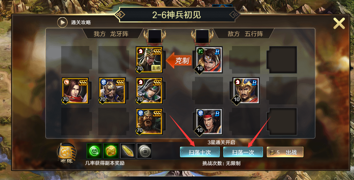 (4)点击扫荡按钮打开扫荡界面,通关关卡3星后可以进行扫荡
