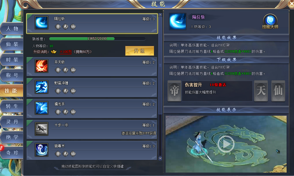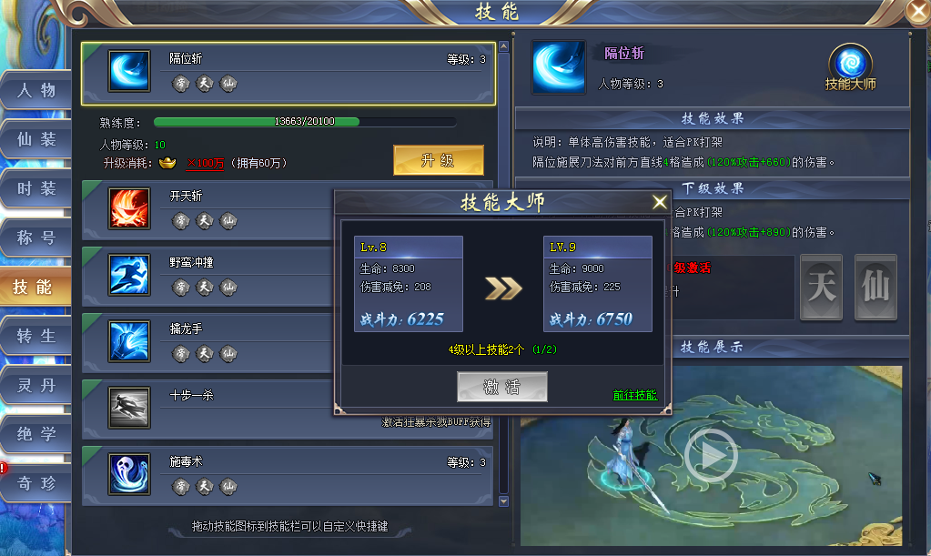 当技能等级达到一定要求时,我们还可激活技能大师,更进一步加强我们的战斗力!