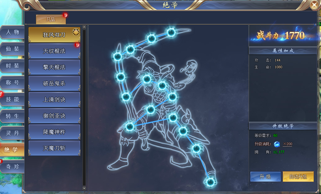 消耗真气升级绝学,获得属性加成。当上一级绝学升满级时,便可升级更高等级的绝学!。