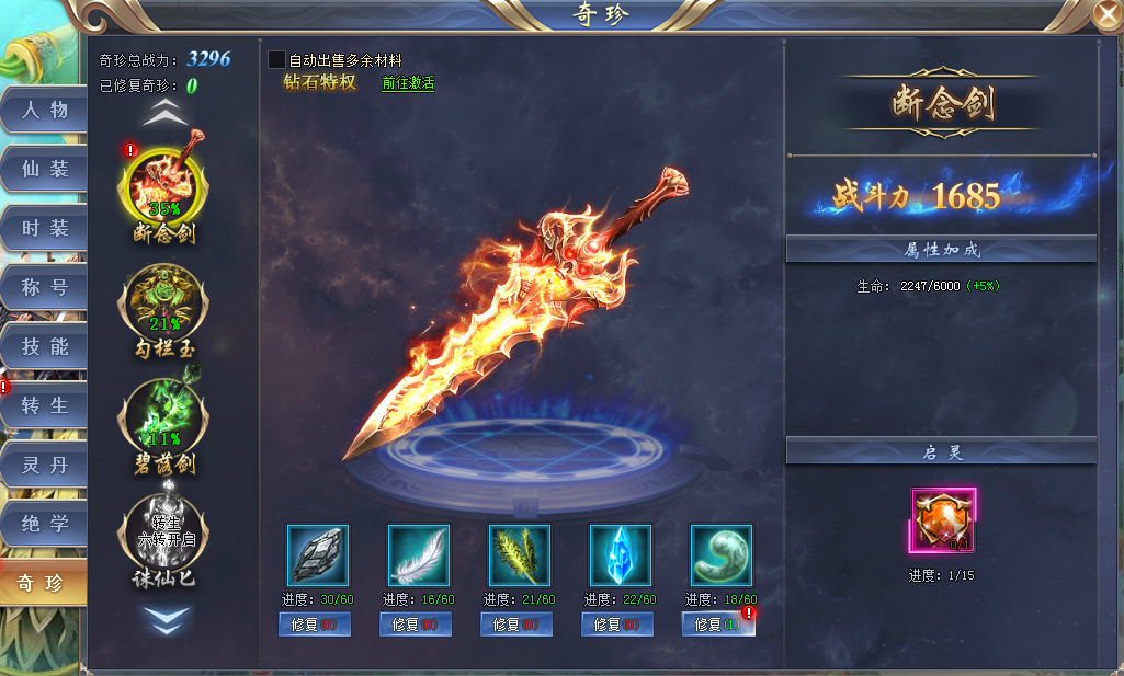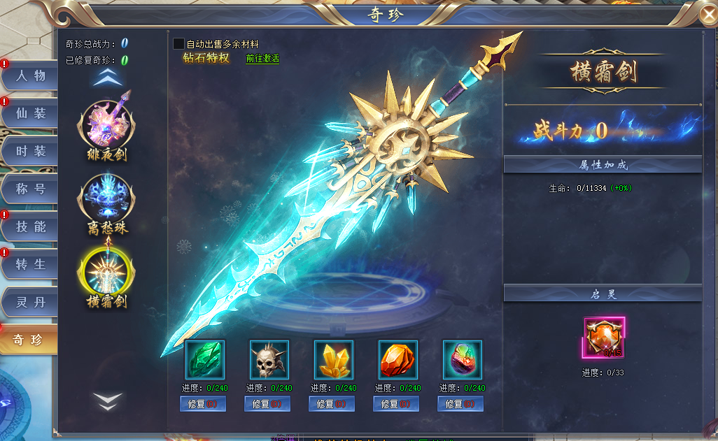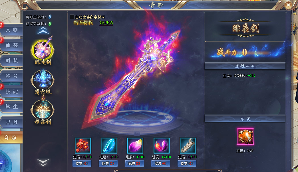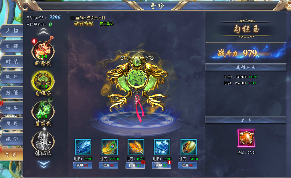 同时,对奇珍还可使用奇珍起灵石,每次启灵可获得奇珍全属性加成5%!奇珍启灵石可以通过开服冲榜活动获得。