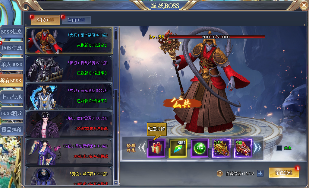 当福利BOSS已经不能满足我们的战力时,可以来试试挑战生肖BOSS,这里的BOSS更为强大!既然是挑战就不可避免有竞争者,展现你真正的实力,击败那些抢你机缘的竞争者独霸BOSS奖励!
