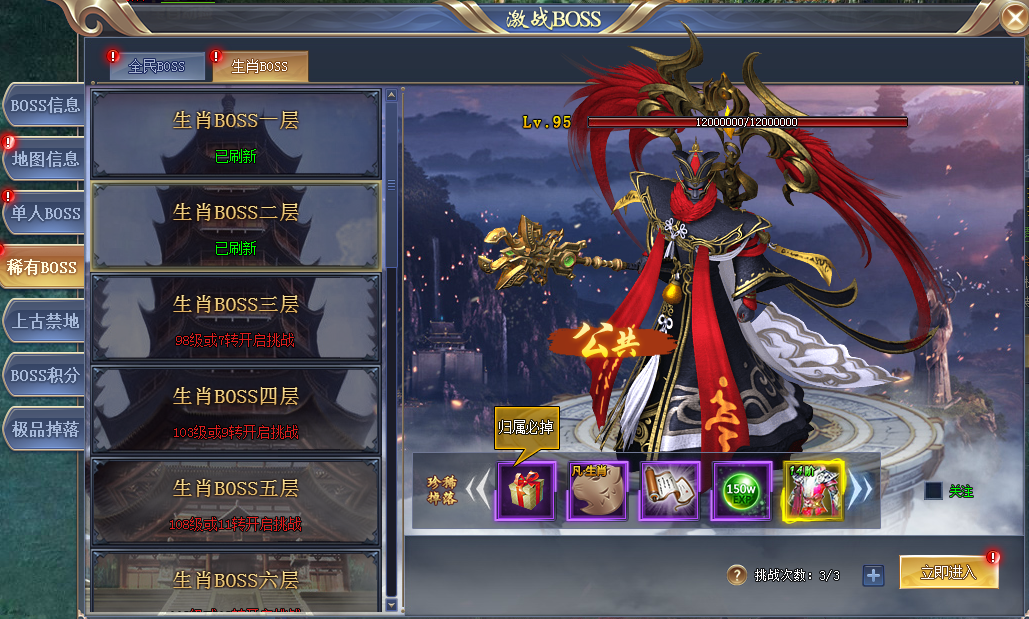 生肖BOSS层数越高,对应的BOSS等级就越高,BOSS掉落的材料装备也就越高越好,待我们准备好时,一定要挑战一下生肖BOSS,确立我们的霸者地位!