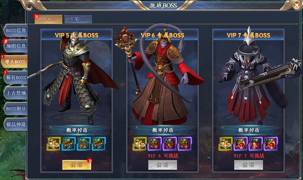只有VIP用户才能挑战的BOSS!VIP BOSS为个人副本,安全打BOSS,从容捡装备!VIP等级越高,可以挑战的BOSS也就越强,掉落的装备也就越极品,各位一定要抓紧机会,激活VIP,挑战属于自己的BOSS,掉落更多更极品的神装!