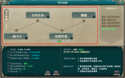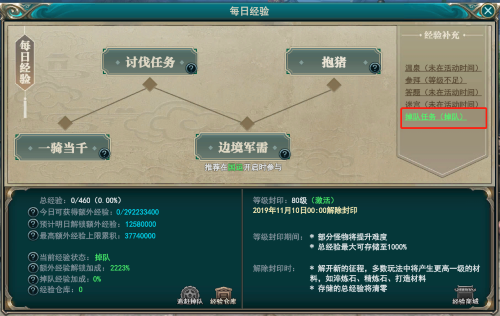日常任务包含一骑当千 边境军需 抱猪 讨伐任务 环任务,完成日常任务时,记得使用王者龙心哦,其中边境军需任务建议在国运期间做,经验加成50%,国运时间可以看国家公告或者国家频道问;