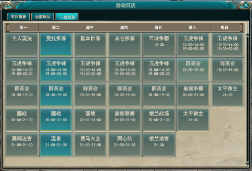 周常活动包含勇闯迷宫 温泉,勇闯迷宫每周一晚九点到九点半,建议大家和家族帮派成员协作完成哦,人多力量大,能迅速找到通往上一层的们,多与他人沟通,会有更好的游戏体验;温泉活动在每周二九点到九点半,进入温泉场景后,记得找泉眼,有两倍加成,活动不要错过,可获得大量经验 。