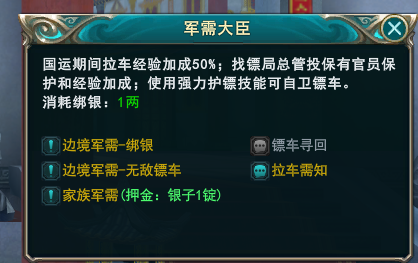 1、在军需大臣处点击军需便可以开始接镖了,你可以接取普通镖车,也可以消耗无敌镖车令接取无法被击毁的无敌镖车,成功接取镖车需要上交一定的银两作为押金,如果在运镖结束时镖车没有被击毁,押金会返还,反之不会返还押金
