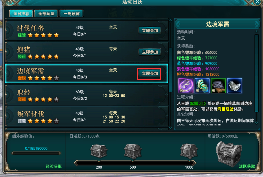 边境军需玩法是一个押镖类玩法,玩家需要护送自己的镖车通过所有检查点,最终领取奖励。边境军需玩法是全天开启的